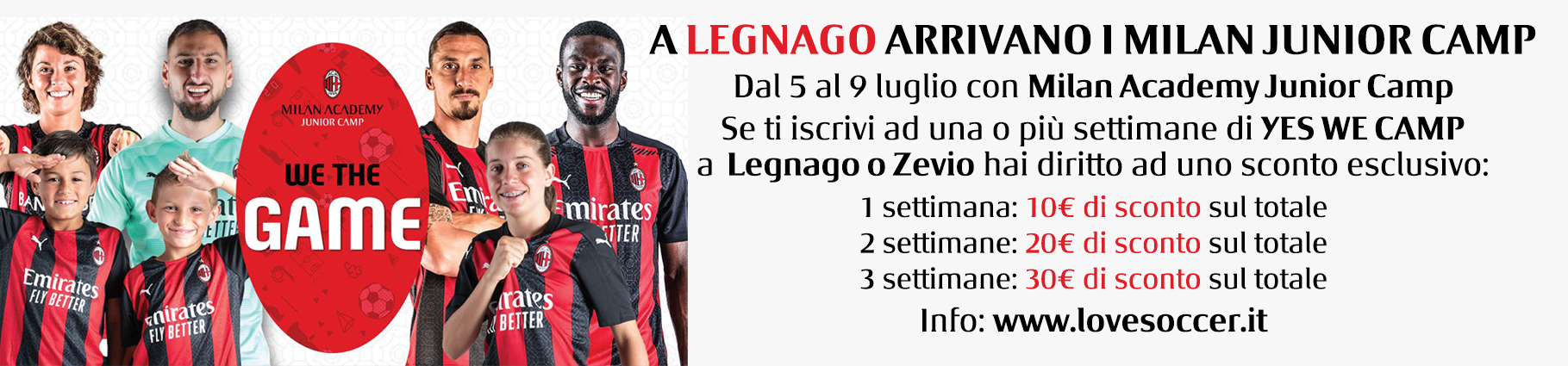Se ti iscrivi infatti ad una o più settimane di YES WE CAMP a Legnago o Zevio 2021, hai diritto ad uno sconto speciale nell’iscrizione al Milan Junior Camp di Legnago dal 5 al 9 Luglio a Legnago (VR) presso il Centro Sportivo Mario Sandrini.